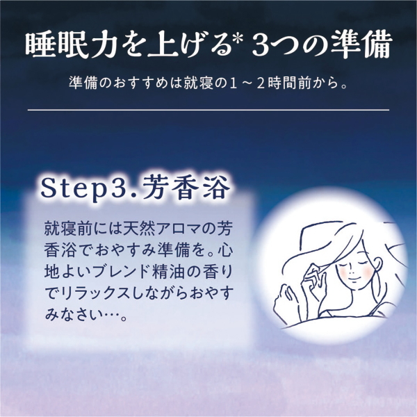 天然アロマでおやすみ準備。 おやすみ準備は空間づくりも大切に。寝室をおやすみ空間にする天然精油配合のリードディフューザー。寝室に入ることで日中のアクティブモードからくつろぎモードにスイッチ。気持ちほぐれる安らぎアロマで心地よい眠りをサポートします。