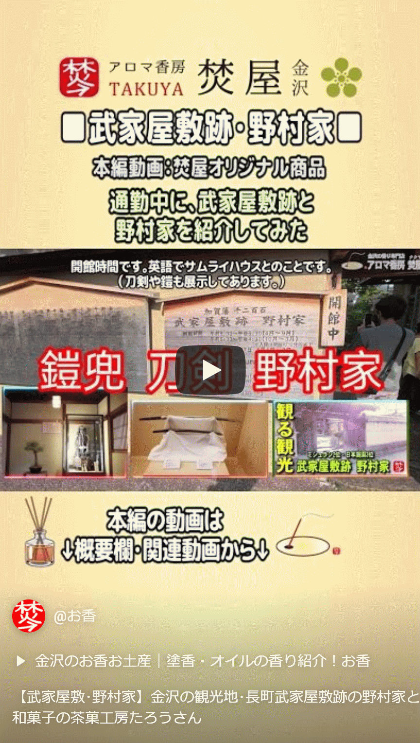 「金沢のお香・アロマ-香り専門店-焚屋」 お香の使い方や焚き方やお香・アロマの香りの最新情報から金沢の風景や季節感を香りと共にお伝えしております。まだチャンネル登録していない方は,この機会にぜひお願いします