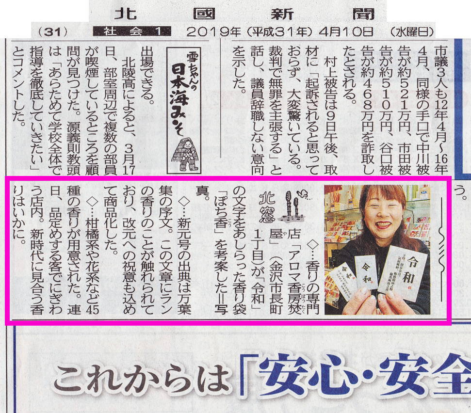 令和ぽち香製品化 北國新聞朝刊に掲載されました。