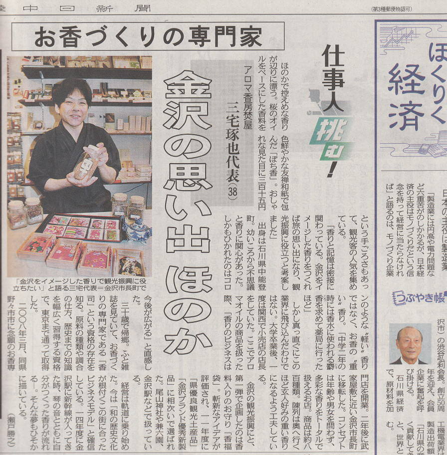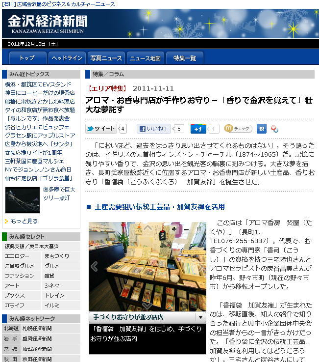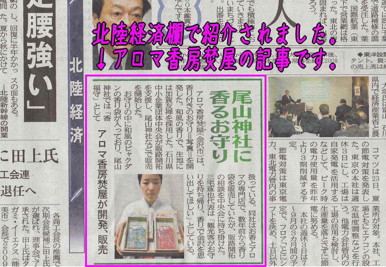 「いしかわ産業化資源活用推進ファンド」採択事業 平成23年度 平成24年度 金沢ブランド優秀新製品 受賞 平成23年度 平成24年度 石川県優良観光土産品 受賞 「アロマ香房 焚屋」メディア情報 現在はブログサイトにて掲載しております。 焚屋 ブログサイト ![]() 焚屋 ブログサイトはこちらクリック ↓クリックしてください↓