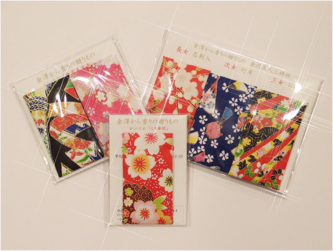 | ●当店の事業プラン | 平成20年に創設された、「いしかわ活性化ファンド事業」に、 アロマ香房焚屋の事業プランが採択されました。 その後地域と香りの融合を目指し、石川県中小企業団体中央会 かが能登かなざわ中小企業応援センターと株式会社北國銀行の 応援の元、地域資源の加賀友禅の生地を 使用して御守形状の香り袋の開発を致しました。 その後、友禅柄を利用して、金沢市と香りとお土産を結びつけた 薄型香り袋「ぽち香」を開発いたしました。 今後は、金沢市の観光のお土産物を販売促進という形で 事業展開を広げていきたいと考えております。 | ||||||||||