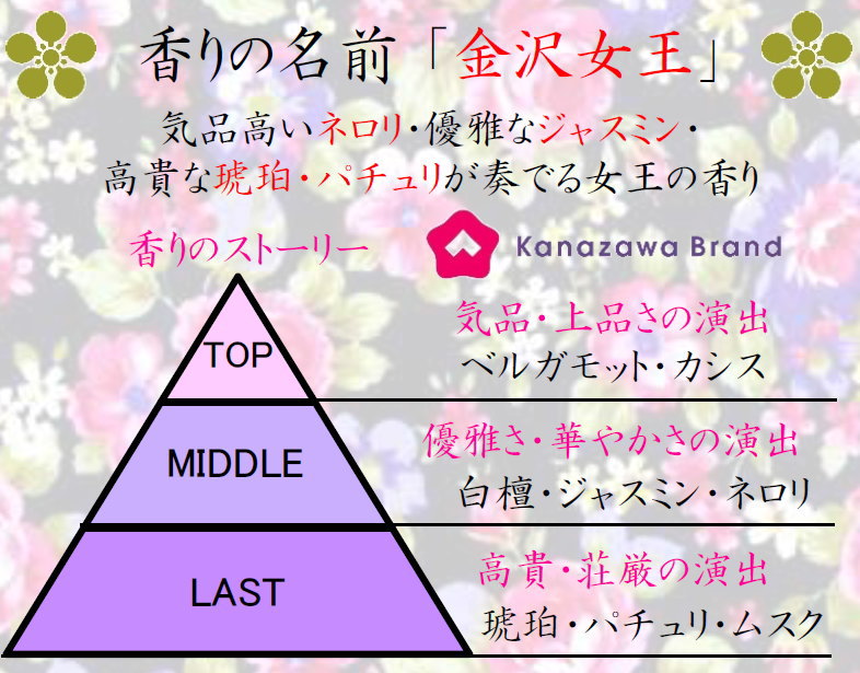 「ぽち香」の香りの名前 ★金沢女王★ <香りのイメージ> 高貴で優雅な気品高い香り。 <名前と香りのコンセプト> 女性らしい香りの頂点を目指して作成しました。 深みと華やかさと気品高さを両立させ 30代からの女性をメインと想定して 作成してあります。 <金沢女王の香り詳細> アロマセラピスト「sumi」監修による香りです。 天からパッと浮かんだインスピレーションで作成したため、 間違えない香りに仕上がっております。 トップノートの気品さと上品さをベルガモット・カシス・レモンで演出 ミドルノートの優雅さをジャスミン・ローズ・ネロリ・白檀で演出 ラストノートの高貴・荘厳さはムスク・パチュリ・琥珀で演出 女性が憧れる気品高い高貴な香りを表現致しました。 ![]() 画像クリックで拡大 その他の種類の香りを見てみる 香りは約3か月ほど持続します。 ※注意)香りの感じ方・持続期間には個人差あり。 |