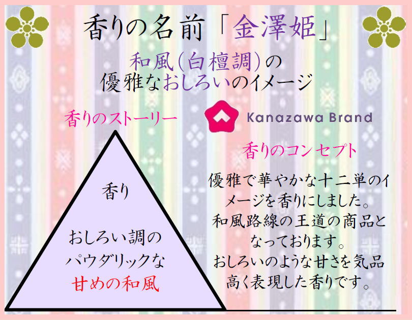 (香り詳細)洋風と和風の白檀とイランイラン・パチュリを組み合わせたエレガントな香り。