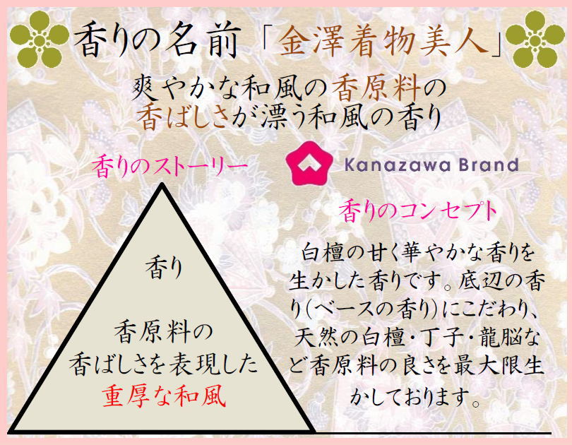(香り詳細)石川県産エアリーフローラをイメージしたエレガントフローラルの香り。