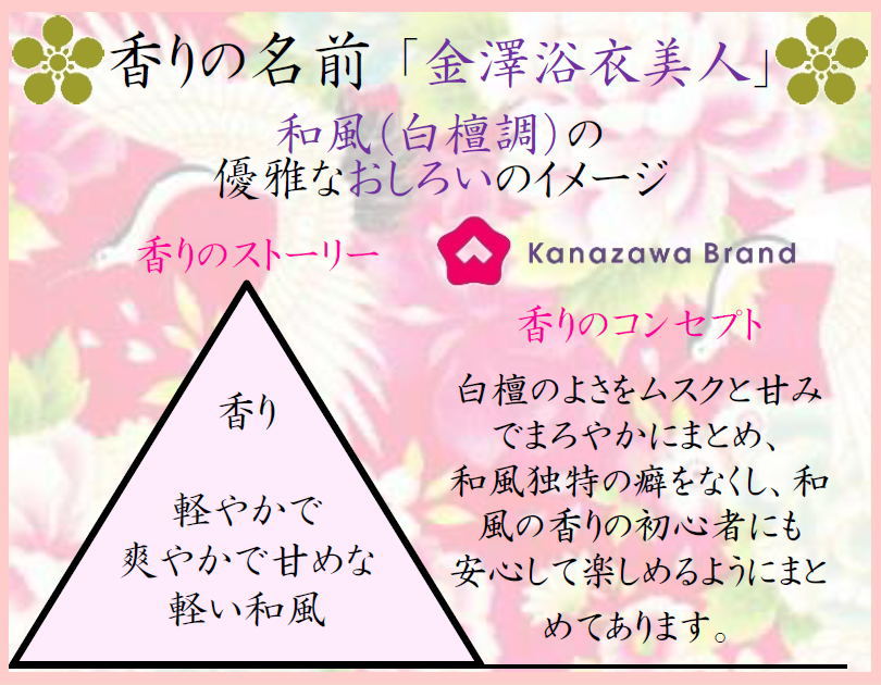 (香り詳細)和風の香り(白檀)の軽めの香りを浴衣美人で表現しました。
