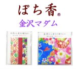 | <ぽち香のスペック詳細> ※注文時に色柄の指定はできません。どうしてもというときはお電話下さい。 ●製品名:「ぽち香」 1枚入 価格 330円(税込) 配るお土産に人気! パッケージサイズ:約 縦6.8cm×横5cm×高さ0.3cm 重量:2.6g 本体1個あたりのサイズ :約 縦5cm×横3cm×高さ0.2cm ●製品名:「ぽち香」 2枚入 価格 605円(税込) 1個当たり302円(税込) パッケージサイズ:約 縦6.5cm×横7cm×高さ0.3cm 重量:4.5g 本体1個あたりのサイズ :約 縦5cm×横3cm×高さ0.2cm ●製品名:「ぽち香」 3枚入 価格 825円(税込) 1個当たり275円(税込) パッケージサイズ:約 縦10cm×横7cm×高さ0.6cm 重量:7.5g 本体1個あたりのサイズ :約 縦5cm×横3cm×高さ0.2cm ●製品名:「ぽち香」 大1枚入 価格 660円(税込) 香りの強さ2倍! 財布名刺入れにピッタリサイズ! ビジネスシーンで香りの”効果”を実感したい方向け パッケージサイズ:約 縦9cm×横7cm×高さ0.6cm 重量:5.5g 本体1個あたりのサイズ :約 縦7.5cm×横6cm×高さ0.2cm |
