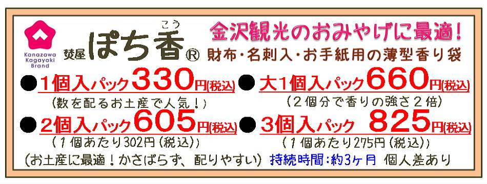 | <ぽち香のスペック詳細> ※注文時に色柄の指定はできません。どうしてもというときはお電話下さい。 ●製品名:「ぽち香」 1枚入 価格 330円(税込) 配るお土産に人気! パッケージサイズ:約 縦6.8cm×横5cm×高さ0.3cm 重量:2.6g 本体1個あたりのサイズ :約 縦5cm×横3cm×高さ0.2cm ●製品名:「ぽち香」 2枚入 価格 605円(税込) 1個当たり302円(税込) パッケージサイズ:約 縦6.5cm×横7cm×高さ0.3cm 重量:4.5g 本体1個あたりのサイズ :約 縦5cm×横3cm×高さ0.2cm ●製品名:「ぽち香」 3枚入 価格 825円(税込) 1個当たり275円(税込) パッケージサイズ:約 縦10cm×横7cm×高さ0.6cm 重量:7.5g 本体1個あたりのサイズ :約 縦5cm×横3cm×高さ0.2cm ●製品名:「ぽち香」 大1枚入 価格 660円(税込) 香りの強さ2倍! 財布名刺入れにピッタリサイズ! ビジネスシーンで香りの”効果”を実感したい方向け パッケージサイズ:約 縦9cm×横7cm×高さ0.6cm 重量:5.5g 本体1個あたりのサイズ :約 縦7.5cm×横6cm×高さ0.2cm |