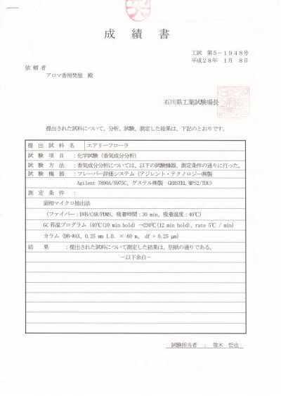 「ぽち香」の香りの名前 ★エアリーフローラ★ <香りのイメージ> 石川県産エアリーフローラをイメージした香り。 ![]() 2016年1月産 アロマ香房焚屋にて撮影 ![]() ![]() 香りの強いピンクを今回のターゲットとしました。 お花屋さん、ありがとうございました。 ★新聞にも掲載されました。★ 平成28年8月1日 北國新聞朝刊にて 石川県のフリージアの新品種の エアリーフローラを当店でアロマオイルとして 製品化した記事が掲載されました。 ![]() 画像クリックで拡大 <名前と香りのコンセプト> 石川県産2016年初旬のエアリーフローラでも香りの特長が 出やすく香りの強いピンクを採取し、 石川県工業試験場の香料分析(ガスクロマトグラフィー)にて分析し 当店のお香とアロマの香りの専門家が金沢観光のお土産に購入する方に 向けた香りを開発しました。 <開発の効果として> ・石川県産のエアリーフローラの知名度を匂い袋を通して広める 香業界の地域連携の試み ・お土産用として県外者に広く広め普及の目標 ・ここでしか買えないご当地感の演出 ・香りが記憶に残りやすい効果を利用した、リピート、再来県を促す 上記開発の目的として、石川県の地域資源を活用いたしました。 石川県工業試験場にての香料分析成績表 ![]() <エアリーフローラとは?> "優雅な春の女神"という意味が込められた名前の「エアリーフローラ」は、 2012年12月にデビューした石川県オリジナル品種のフリージアです。 開花の 最盛期が卒業や入学など新たな旅立ちの時期と重なることから、 キャッチフレーズは「旅立ちを祝う花」、 そして、花言葉は「希望」です。フリージアと言えば 日本では黄色が一般的ですが、エアリーフローラは現在7色で展開中。 <香り詳細> 代表香司「焚屋」とアロマセラピスト「sumi」監修による香りです。 対象年齢を全年齢対応として、万人受けする香りに仕上げました。 実際のエアリーフローラは7種類の色ですが、 当店は香りでこれを表現して、出会いと別れの香りの記憶として、 エアリーフローラの香りをメインに花々の優しい甘さを添えたフローラルの香り 様々な色を香りで表現し、シトラス、フローラル、ローズなどの華麗さを 表現したエレガントフローラルです。 <香りの詳細> ●トップノートをフレッシュさをフレッシュフリージアの香りで演出 ●ミドルノートを華やかさとし華やかフリージアで演出 ●ベースノートを華麗さとし華麗なフリージアにて演出 ![]() 香りのピラミッド クリックで拡大 その他の種類の香りを見てみる 香りは約3か月ほど持続します。 ※注意)香りの感じ方・持続期間には個人差あり。 |