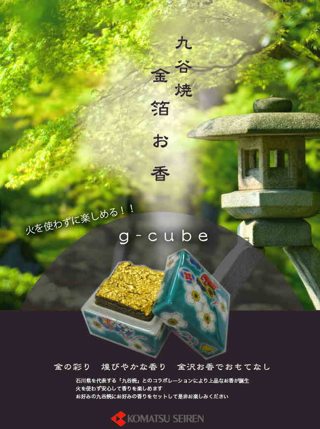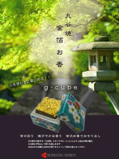 石川県を代表する伝統工芸「九谷焼」とのコラボレーションにより上品なお香、匂い箱、香箱が誕生しました。 その名も「G-CUBE ジーキューブ」 お香と違い火を使わず、安心して香りを楽しめます。お好みの容器にお好みの香りをセットして 是非お楽しみ下さい。