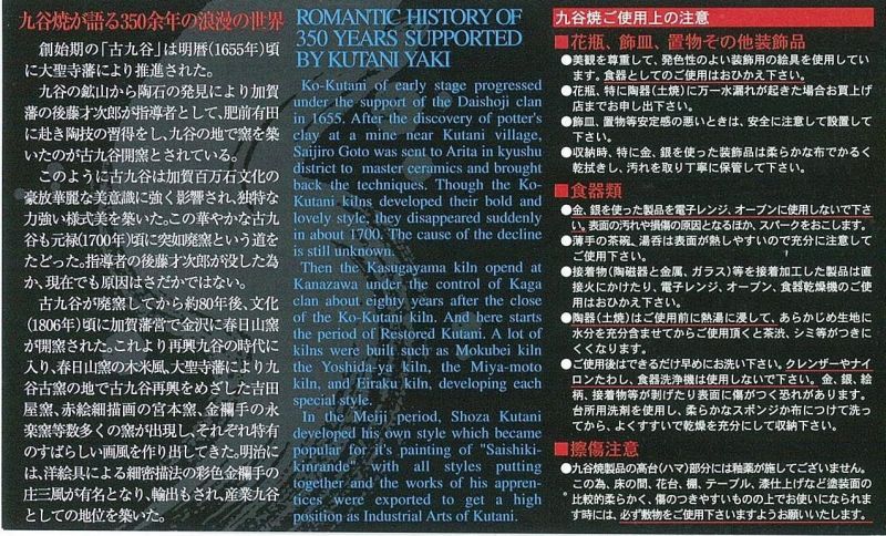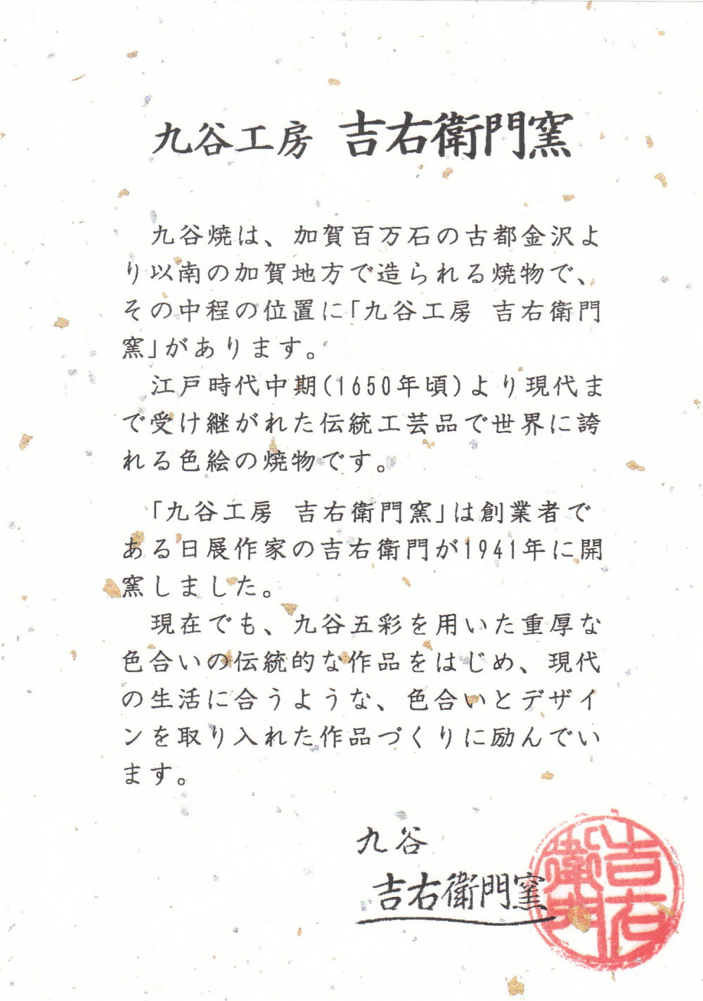 手にとった時に感じる、和絵具のなめらかな質感もきっと楽しんでいただけることでしょう。独自な個性を放ちながら、生活に深く息づいていく伝統工芸品「九谷焼」。どうぞ末永くご愛用ください。
