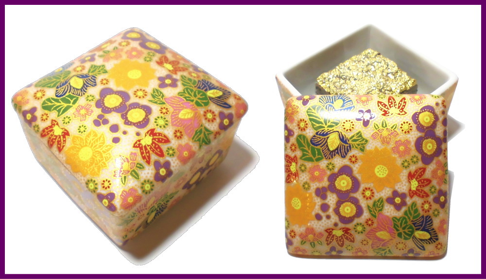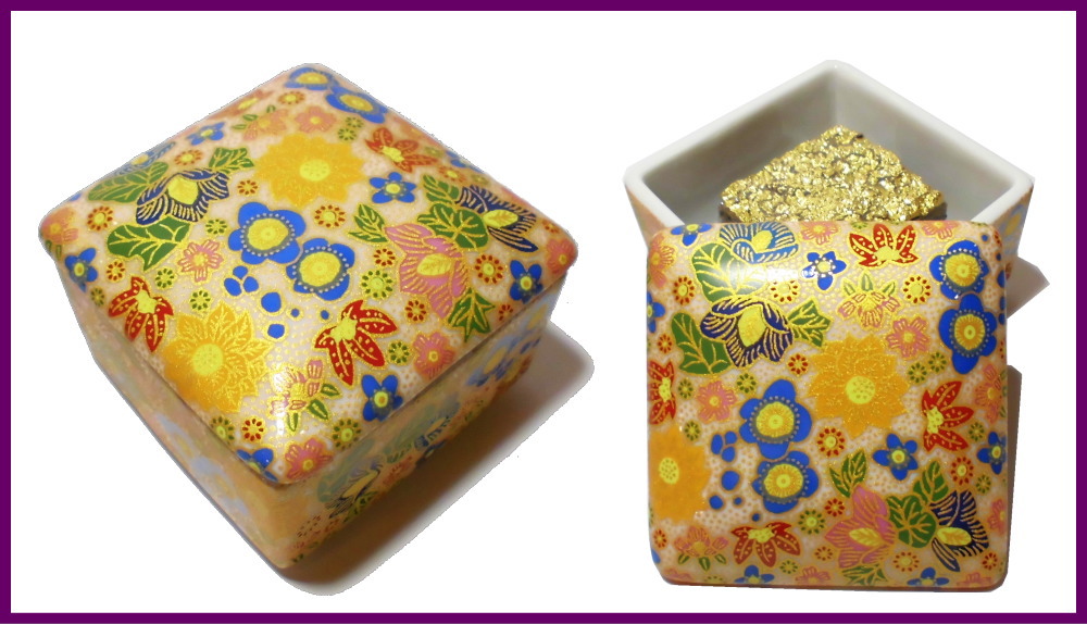 九谷焼金箔G-CUBE、九谷焼の香箱 となるとかなり高級感が増します。画像は青手牡丹と金箔のセラミックスの組合せです。