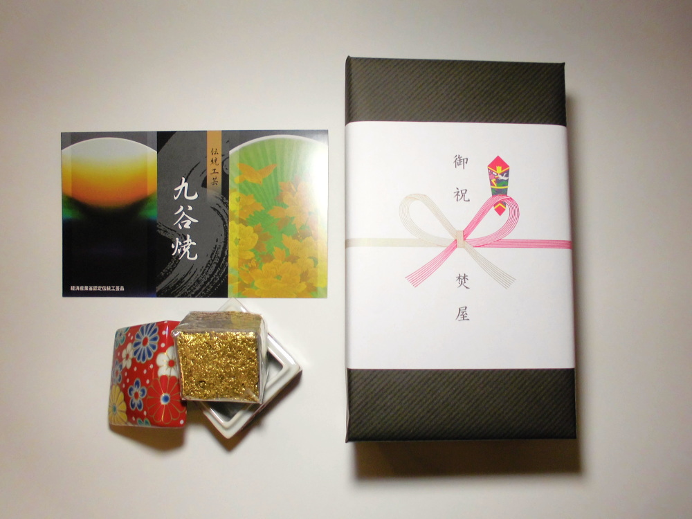 石川県のおみやげで伝統工芸を2種類(九谷焼と金箔)もまとめて贈れるとのことで非常に観光客や贈り物、引き出物にも好評です。