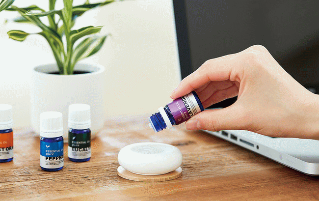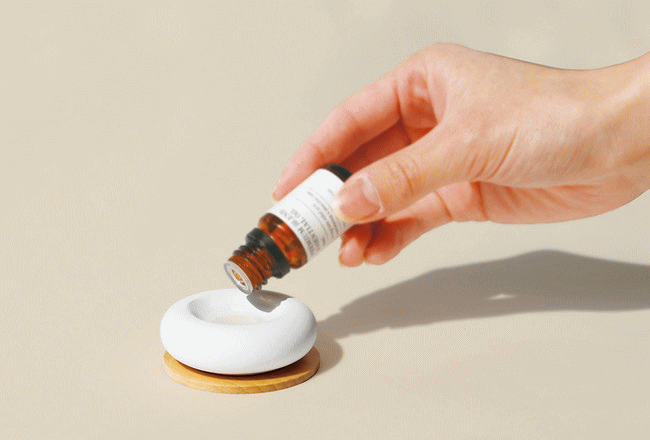 ○本体を付属のコースターに置き、中央のくぼみにエッセンシャルオイルやアロマオイルを直接2〜5滴垂らし、香りをお楽しみください。