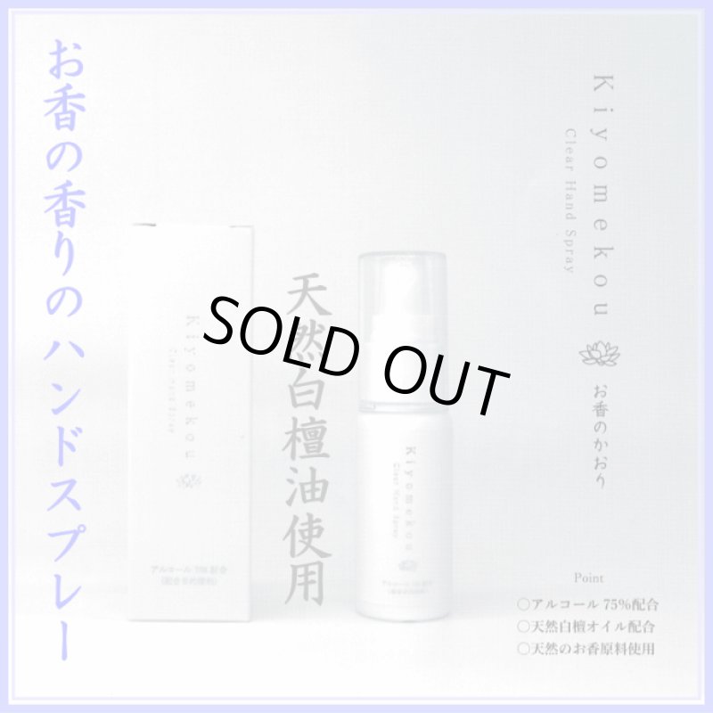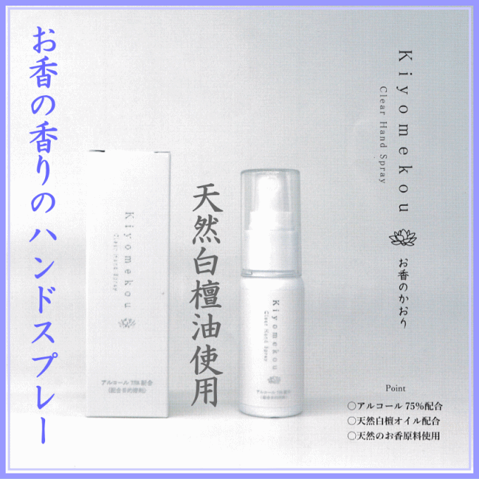 お香屋こだわりの塗香×アルコールハンドスプレー『Kiyomekou Clear Hand Spray』は、「清め香」とも呼ばれる塗香をもとに、天然のお香原料から抽出した自檀オイルと漢薬オイルを数種類調含し製造しております。アルコール75%で手指をきれいにするだけでなく、やすらぐお香の香りで心を癒します。