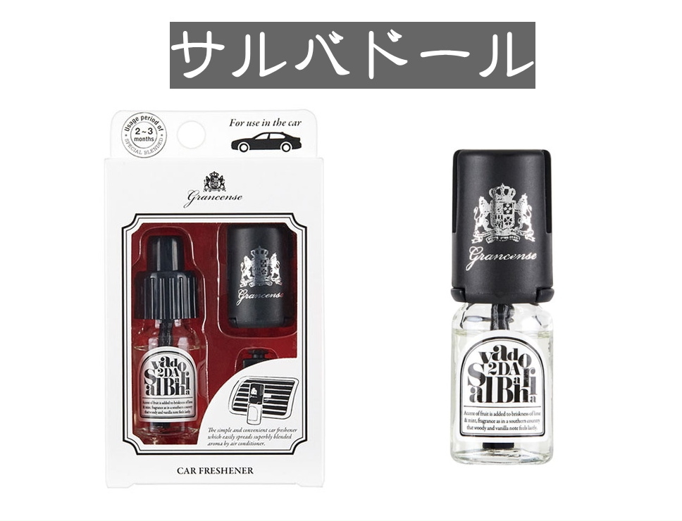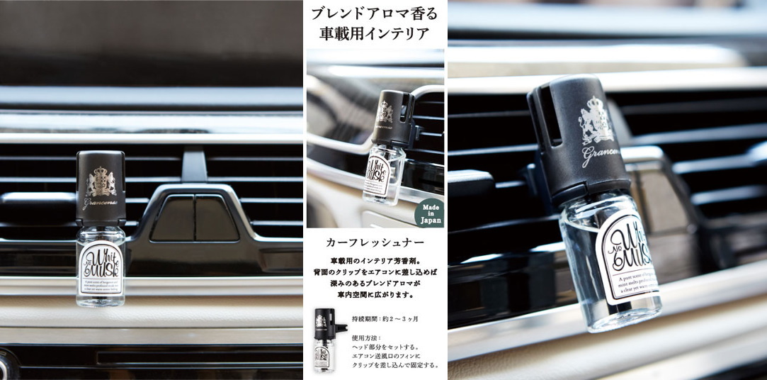 オリジナルデザインの車載用フレグランスアイテムです。背面のクリップをエアコンの送風口に差し込んでお使いいただくと、グランセンスの深みのあるブレンドアロマが車内空間に広がります。