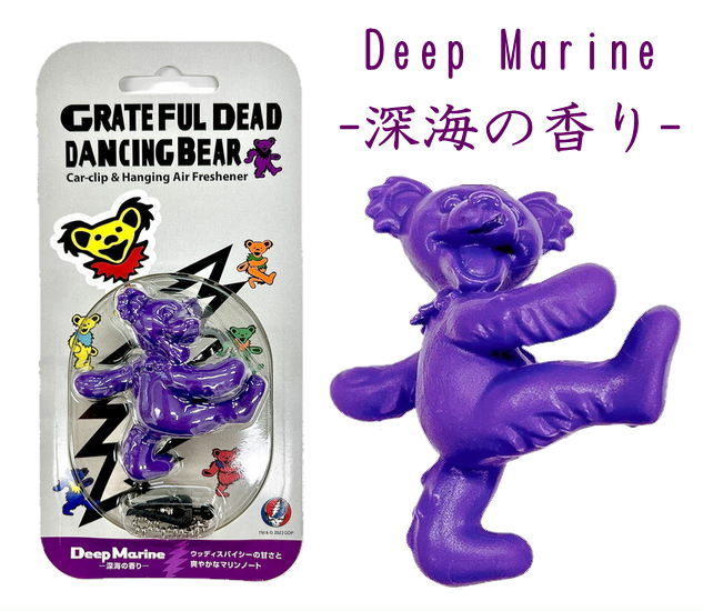 アメリカを代表する伝説的バンド「GRATEFUL DEAD」のマスコットキャラクター「Dancing Bear」。 樹脂に香りを染み込ませ、商品自体から香りがする新しいタイプのカーフレグランス商品です。 付属のキーチェーンを付けることでキーホルダーとしてもご使用いただけます。 80〜90年代に話題となったバンド、キャラクターですが現在様々なコラボ商品が販売されておりどこかで見たことがある、という方も多いです。香りはアメリカっぽい甘くて強い香りをチョイスしております。
