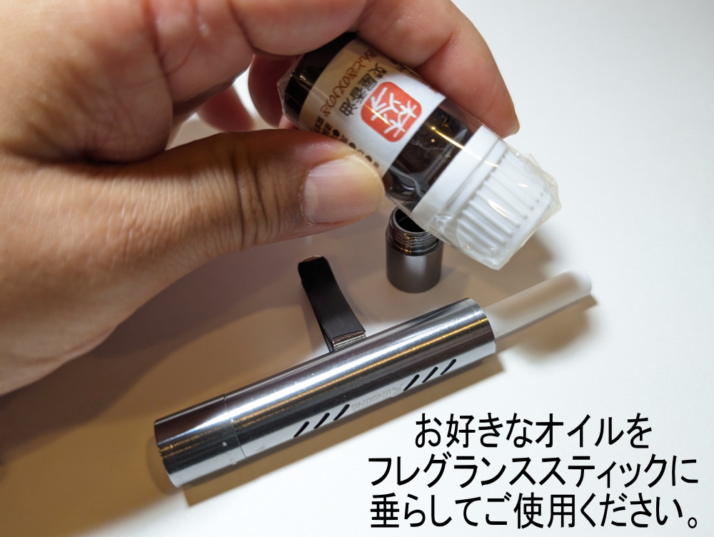 フレグランスオイルを無香のフレグランススティックに垂らして使用します。