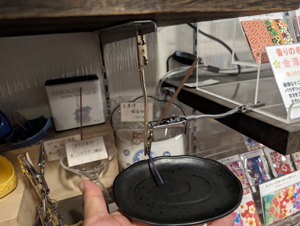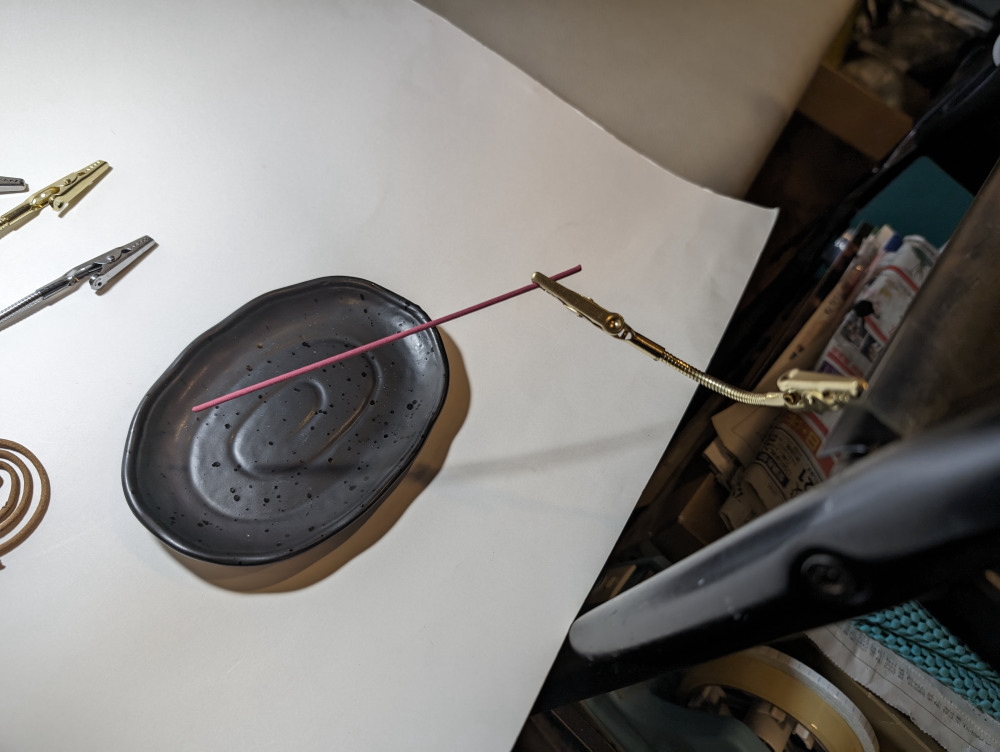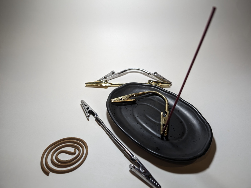 両方にクリップが付いたタイプのお香立てです。使い方に決まりはございませんので、使い方が思いつく方はお買い求めくださいませ。