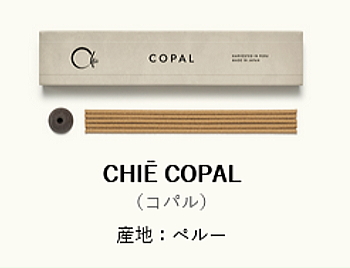 コパルの香りは、スパイシーが特徴です。主原料:コパル(ペルー産)。燃焼時間:約60分