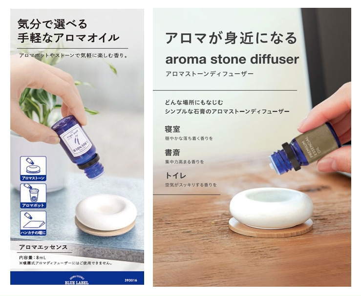 ○本体を付属のコースターに置き、中央のくぼみにエッセンシャルオイルやアロマオイルを直接2〜5滴垂らし、香りをお楽しみください。