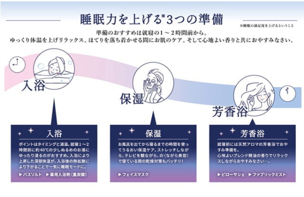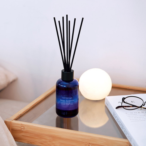 天然アロマでおやすみ準備。 おやすみ準備は空間づくりも大切に。寝室をおやすみ空間にする天然精油配合のリードディフューザー。寝室に入ることで日中のアクティブモードからくつろぎモードにスイッチ。気持ちほぐれる安らぎアロマで心地よい眠りをサポートします。