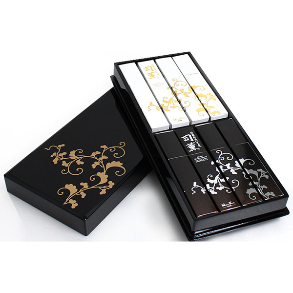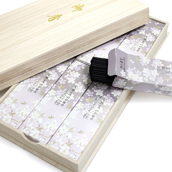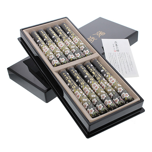 お線香は黒地に上品な桜の花をあしらった巻紙でお包みしています。