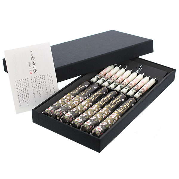 散り際の花びらの色にちなみ「淡墨の桜」とよばれるその桜に想いを馳せて作りあげた、お線香とローソクの贈答品です。