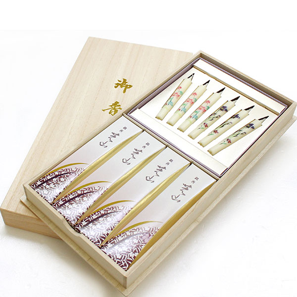 セット内容(主原料): 特撰淡墨の桜 6把(タブ粉、香料) 絵ローソク 8本